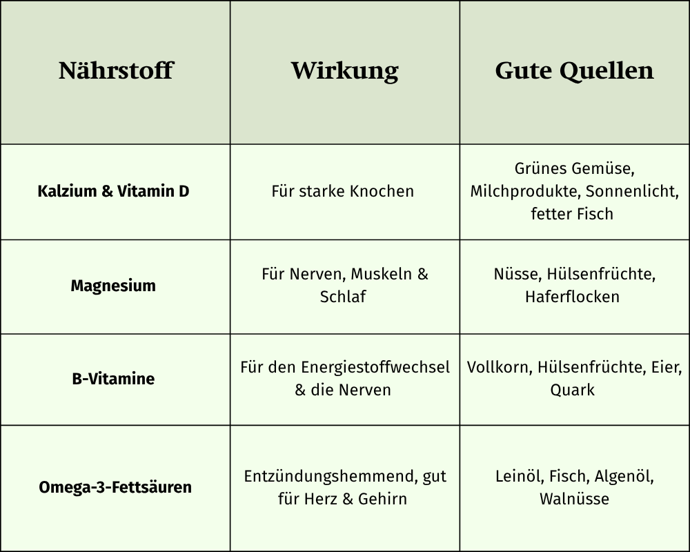 In den Wechseljahren steigt der Bedarf an bestimmten Mikronährstoffen, um hormonelle Prozesse, Knochenstabilität und den Energiestoffwechsel optimal zu unterstützen: