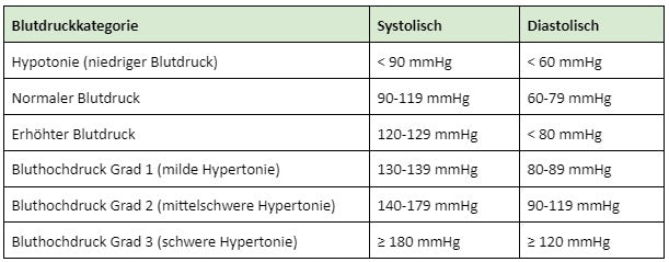 Blutdruck bezeichnet die Kraft, die das Blut auf die Wände der Blutgefäße ausübt, während es durch den Körper zirkuliert. Dieser Druck sorgt dafür, dass alle Zellen mit Sauerstoff und Nährstoffen versorgt werden. Der Blutdruck wird durch zwei Werte gemessen: den systolischen Wert(wenn das Herz das Blut in die Arterien pumpt) und den diastolischen Wert (wenn das Herz sich zwischen den Schlägen entspannt). Der Blutdruck wird in mmHg angegeben, zum Beispiel 120/80 mmHg. Die folgende Tabelle zeigt die Kategorisierung von Blutdruckwerten entsprechend der international anerkannten Standards: