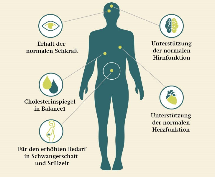 Gesundheitliche Vorteile von Omega-3: Sehkraft, Hirnfunktion, Cholesterinbalance, Herzfunktion und Bedarf in Schwangerschaft und Stillzeit.