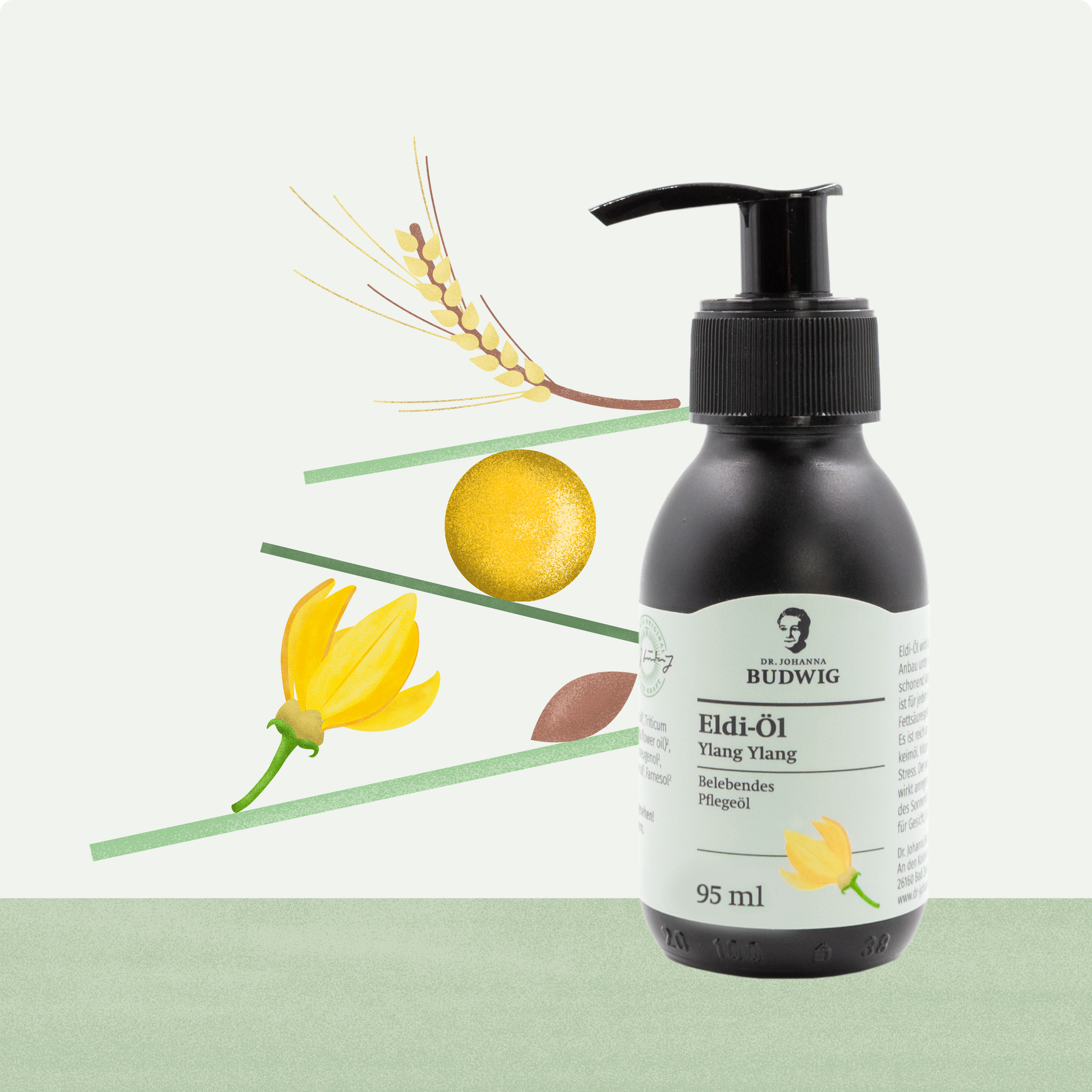 Durch den großen Anteil an Leinöl ist das Eldi-Öl reich an der pflanzlichen Omega-3-Fettsäure Alpha-Linolensäure (ALA). Das enthaltene Weizenkeimöl unterstützt mit einem hohen Gehalt an Vitamin E, das helfen kann, Körperzellen vor oxidativem Stress zu schützen. Es ergänzt somit die Wirkeigenschaften des Leinöls. Ätherisches Ylang Ylang Öl hat eine beruhigende Wirkung auf sensible Haut. Der würzig-erdige Duft unterstützt die mentale Entspannung.