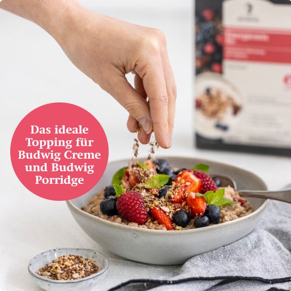 Für die tägliche Portion Energie empfiehlt sich Dr. Budwig Energiemix – ein ballaststoffreiches Topping aus geschroteten, mit Apfelsaftkonzentrat umhüllten Leinsamen, Sonnenblumenkernen und Fruchtflocken in Bio-Qualität. Leinsamen werden für ihre verdauungsfördernde Wirkung geschätzt. Sie sind besonders reich an Ballaststoffen und wirken wohltuend im Rahmen einer ausgewogenen, abwechslungsreichen Ernährung
