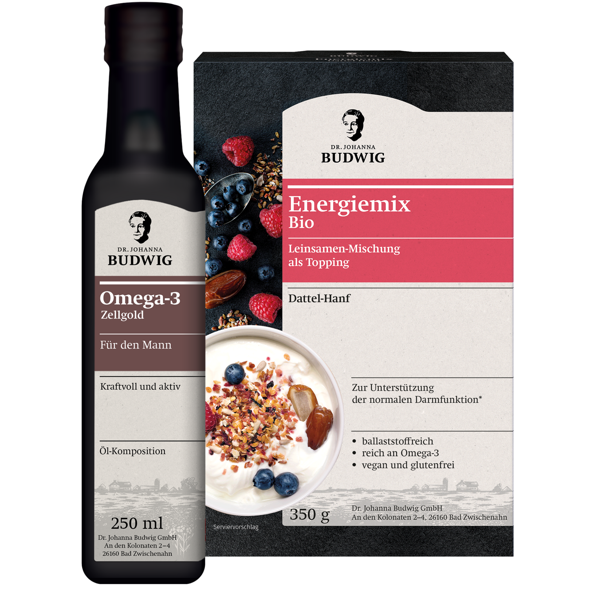 Unser Kennenlern-Paket für den Mann versorgt dich optimal mit wertvollen Omega-3-Fettsäuren, Vital- und Ballaststoffen und sorgt in Kombination mit Quark oder Porridge für einen gesunden Start in den Tag. Dr. Budwig Omega-3 Zellgold für den Mann unterstützt die Vitalität durch die wirkungsvolle Kombination aus Lein- und Algenöl sowie Sesamöl- und Arganöl. Dr. Budwig Energiemix ist eine ballaststoffreiche Kombination aus geschroteter und geschützter, gelber und brauner Leinsaat, Sonnenblumenkernen und natursüßen Erdmandeln.