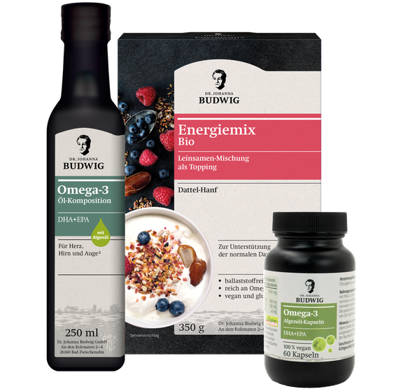 - Das Paket enthält: 250 ml Dr. Budwig Omega-3 DHA+EPA, 350 g Energiemix Dattel-Hanf, Omega-3 Algenöl Kapseln (60 Stck.)