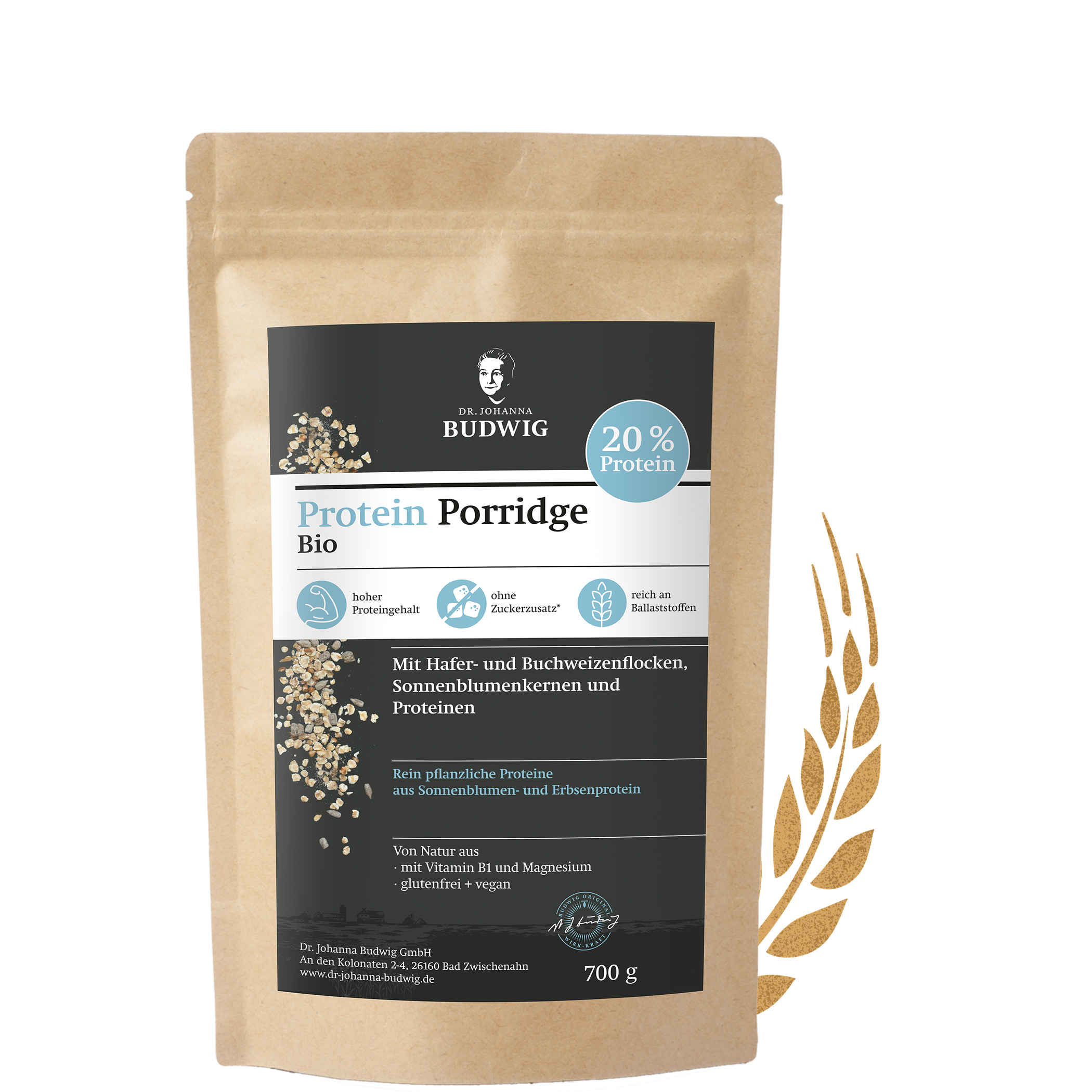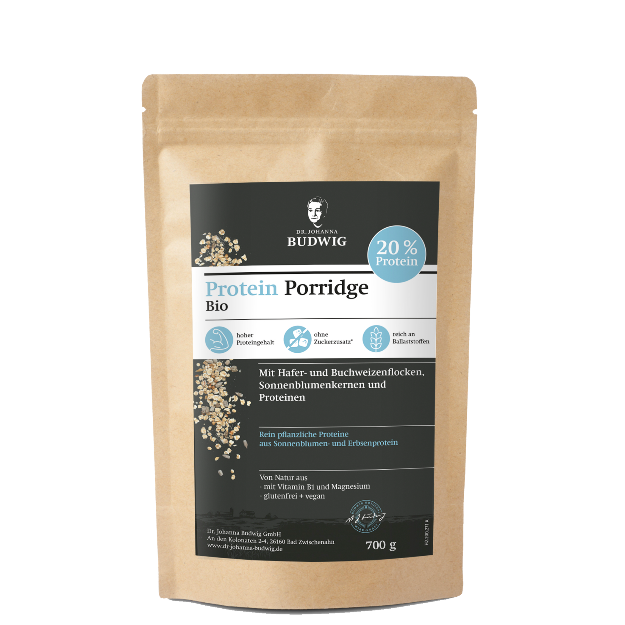 Dr. Budwig Porridge ist eine köstliche Kombination aus Hafer- und Buchweizenflocken, gekeimten Buchweizen, Sonnenblumenkernen, Leinsamen, pflanzlichen Proteinen und Sonnenblumen-Crispies. Die Proteine stammen aus Erbsen- und Sonnenblumenproteinen. Eine vegane Proteinquelle, die auch ohne Zuckerzusatz unglaublich lecker schmeckt. Alle Zutaten stammen aus 100 % Bio-Anbau und sind glutenfrei.