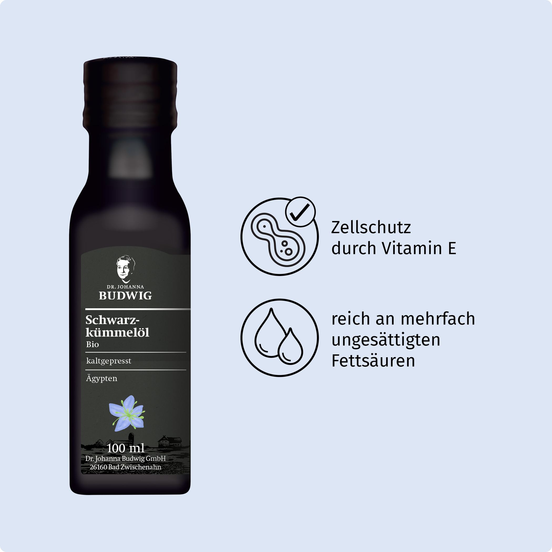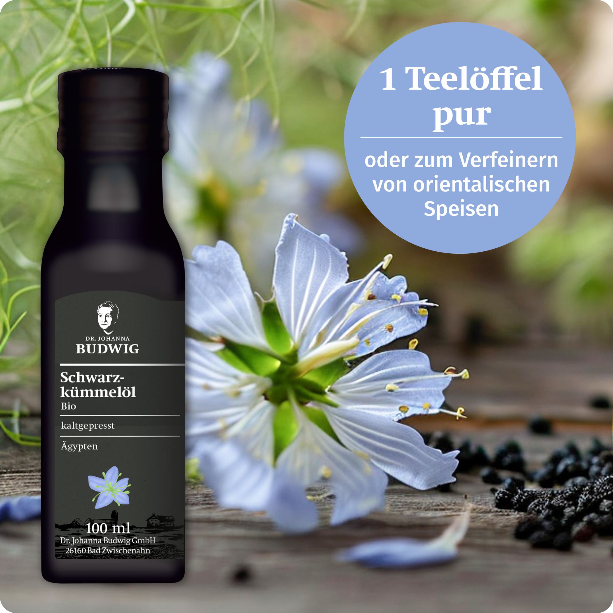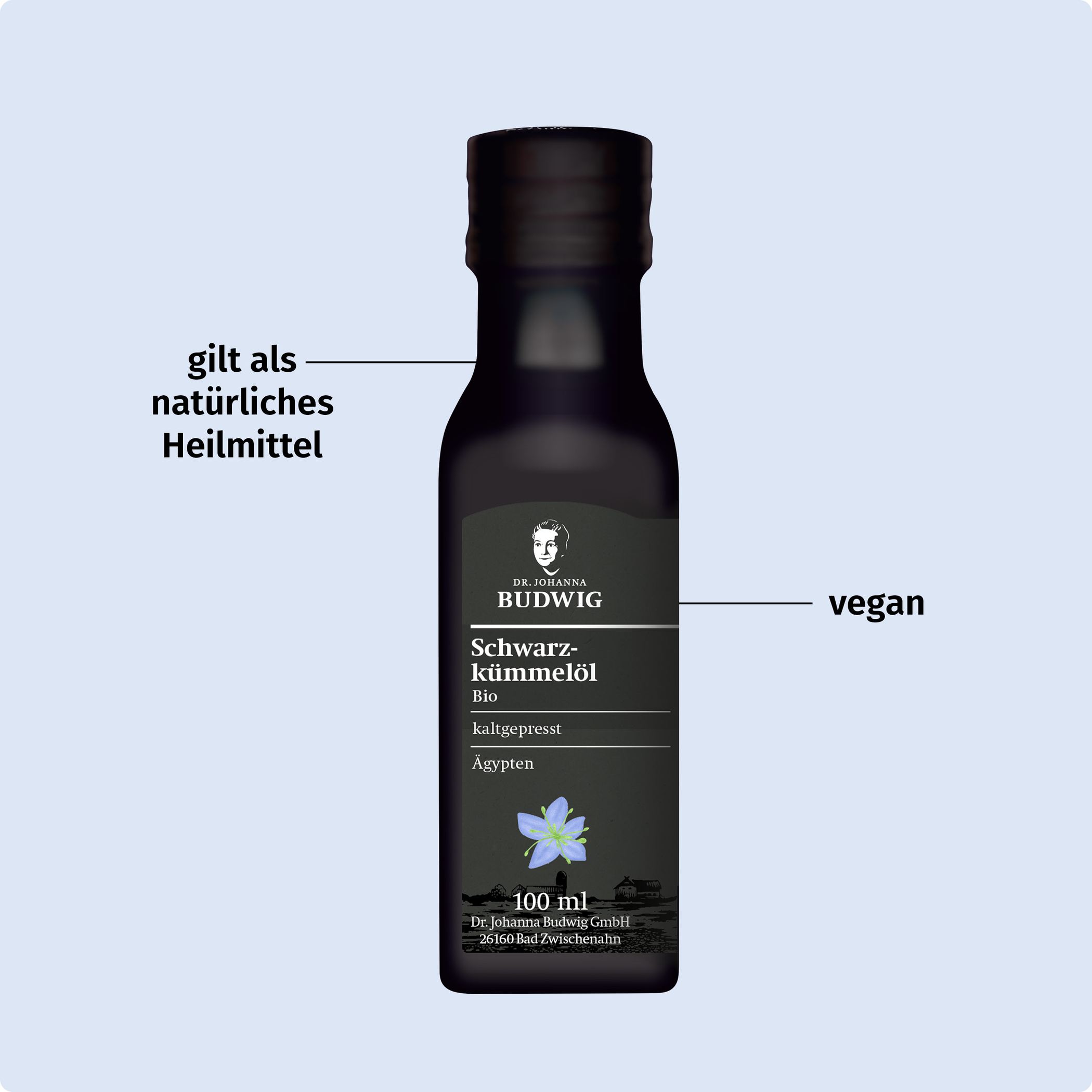 - Kaltgepresstes, gefiltertes Schwarzkümmelöl
