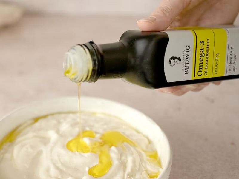 In eine Schüssel füllen und 1-2 EL Dr. Budwig Omega-3 Öl unterrühren.