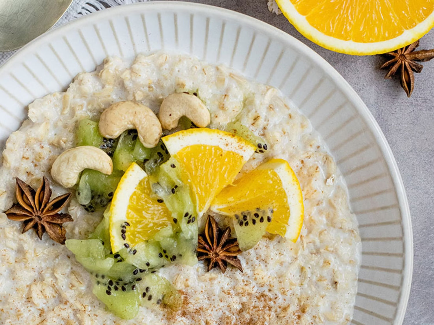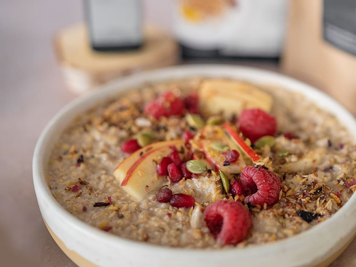 Porridge mit Obst der Saison und Dr. Budwig Energiemix verfeinern.