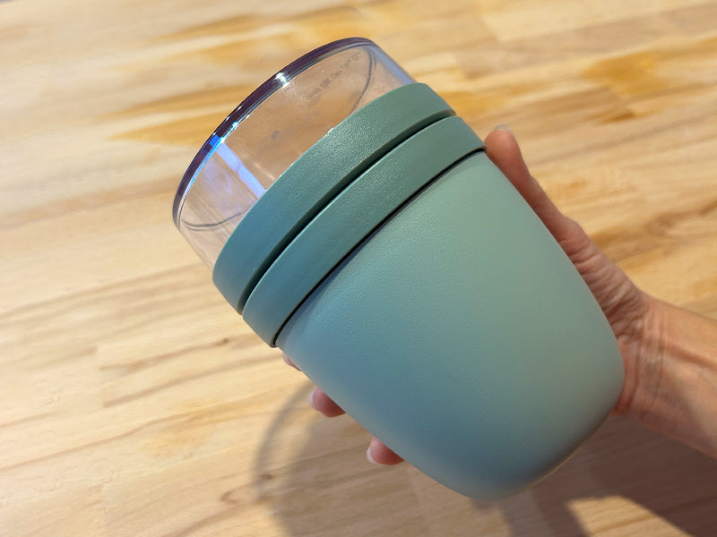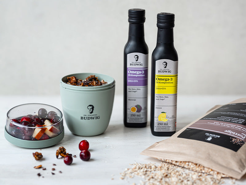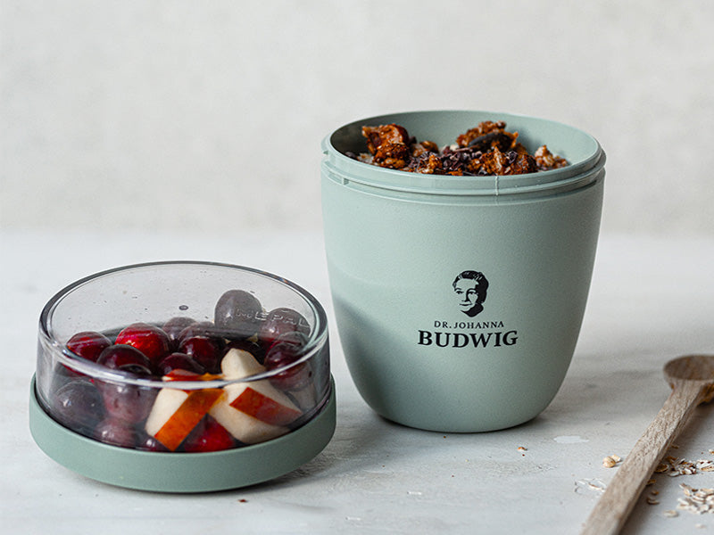 Man kann darin sowohl das Porridge als auch die Budwig Creme genießen – also perfekt, um sich unterwegs oder im Büro schnell ein gesundes Frühstück zuzubereiten. So hat man eine praktische und leckere Lösung für einen energievollen Start in den Tag.