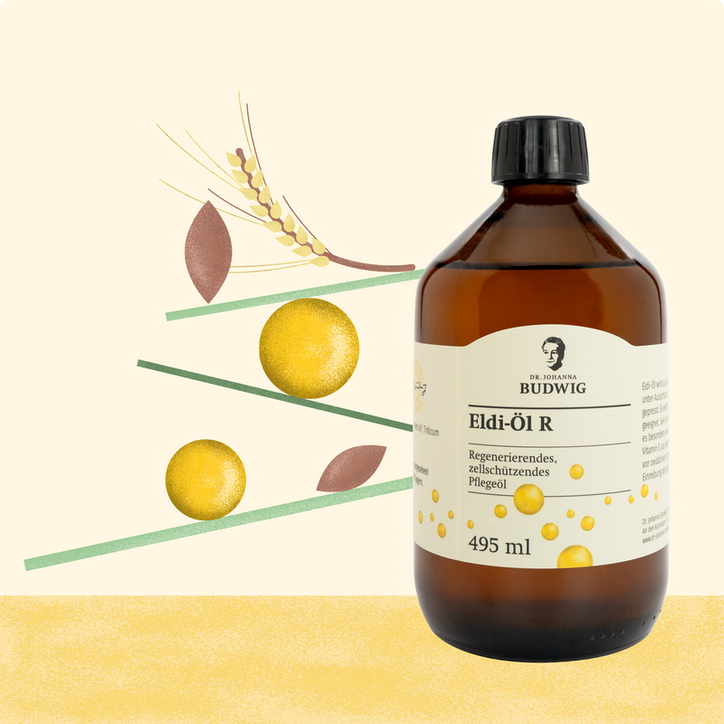 Durch den großen Anteil an Leinöl ist das Eldi-Öl reich an der pflanzlichen Omega-3-Fettsäure Alpha-Linolensäure (ALA). Das enthaltene Weizenkeimöl unterstützt mit einem hohen Gehalt an Vitamin E, das helfen kann, Körperzellen vor oxidativem Stress zu schützen. Es ergänzt somit die Wirkeigenschaften des Leinöls. Eldi Öl R ist für die äußerliche Anwendung geeignet.