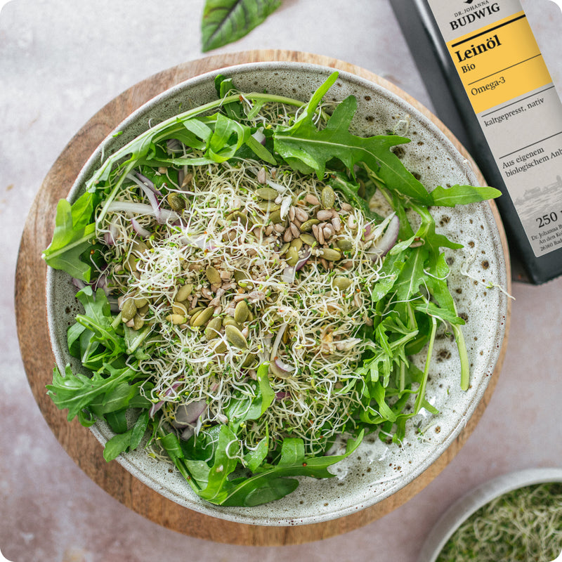 Leinöl muss nicht bitter schmecken! Viele Menschen erleben Leinöl als bitter, weil es empfindlich auf Oxidation reagiert und bei nicht sauberer Herstellung oder Lagerung schnell ranzig werden kann. Die Ursache dafür liegt in seinem hohen Gehalt an Alpha-Linolensäure (ALA), einer wertvollen, mehrfach ungesättigten Omega-3-Fettsäure, die jedoch durch ihre Struktur besonders anfällig für Geschmacksveränderungen ist. Unser Budwig Leinöl wird besonders schonend mit dem Original-Budwig-Pressverfahren hergestellt, um ein möglichst mildes und angenehmes Geschmackserlebnis zu erzielen. – ohne einen unangenehmen Bittergeschmack.