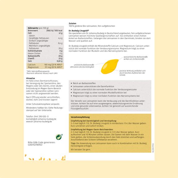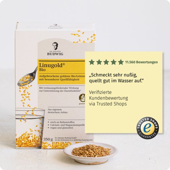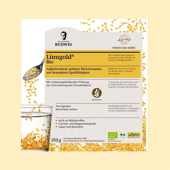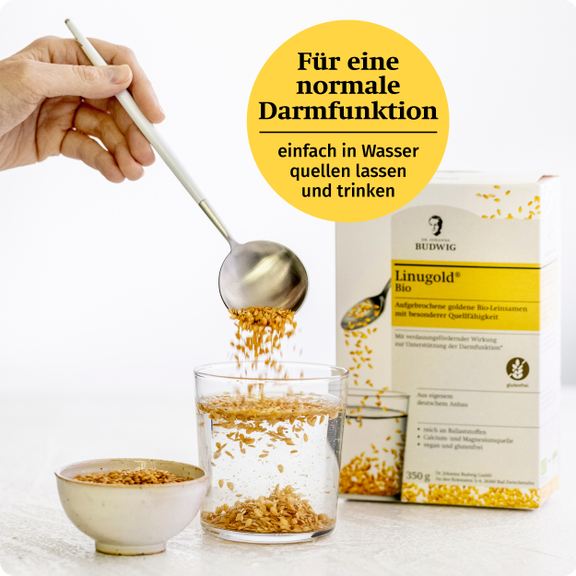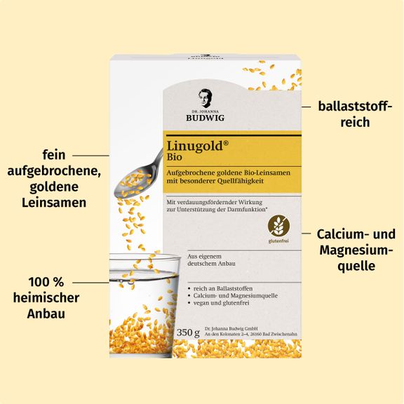Die von Dr. Johanna Budwig in Deutschland angebauten, fein aufgebrochenen Leinsamen weisen höchste Quelleigenschaften auf. Die Wirkung der gesundheitsfördernden Bestandteile wird durch das sanfte Aufbrechen der schützenden Schale aktiviert. Dr. Budwig Leinsamen sind besonders reich an Ballaststoffen. Gelangen sie in den Darmtrakt, binden sie dort Wasser und quellen auf. Dr. Budwig Linugold enthält die Mineralstoffe Calcium und Magnesium. Calcium unterstützt auch die normale Funktion der Verdauungsenzyme. Magnesium trägt auch zu einer normalen Funktion der Muskeln und des Nervensystems bei.