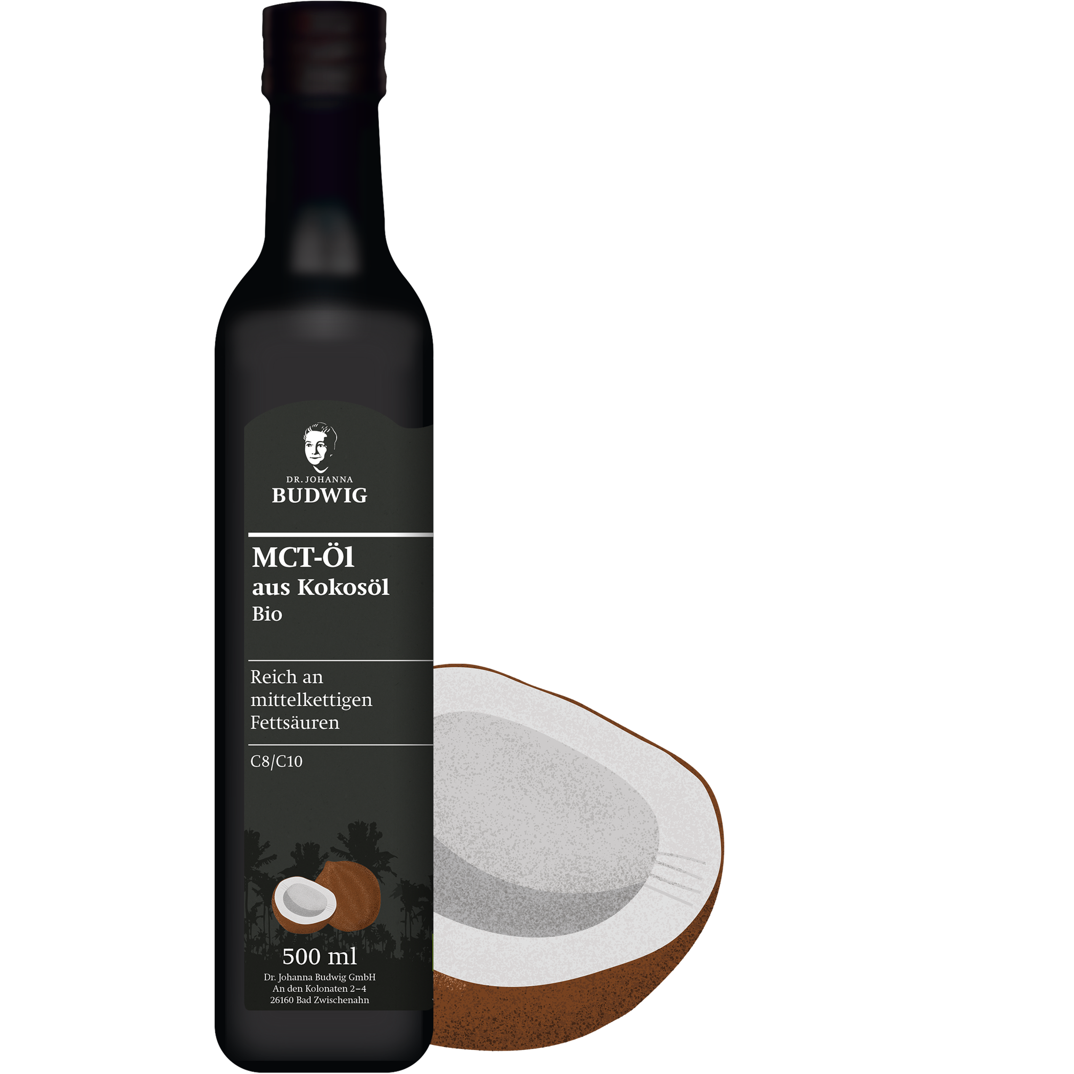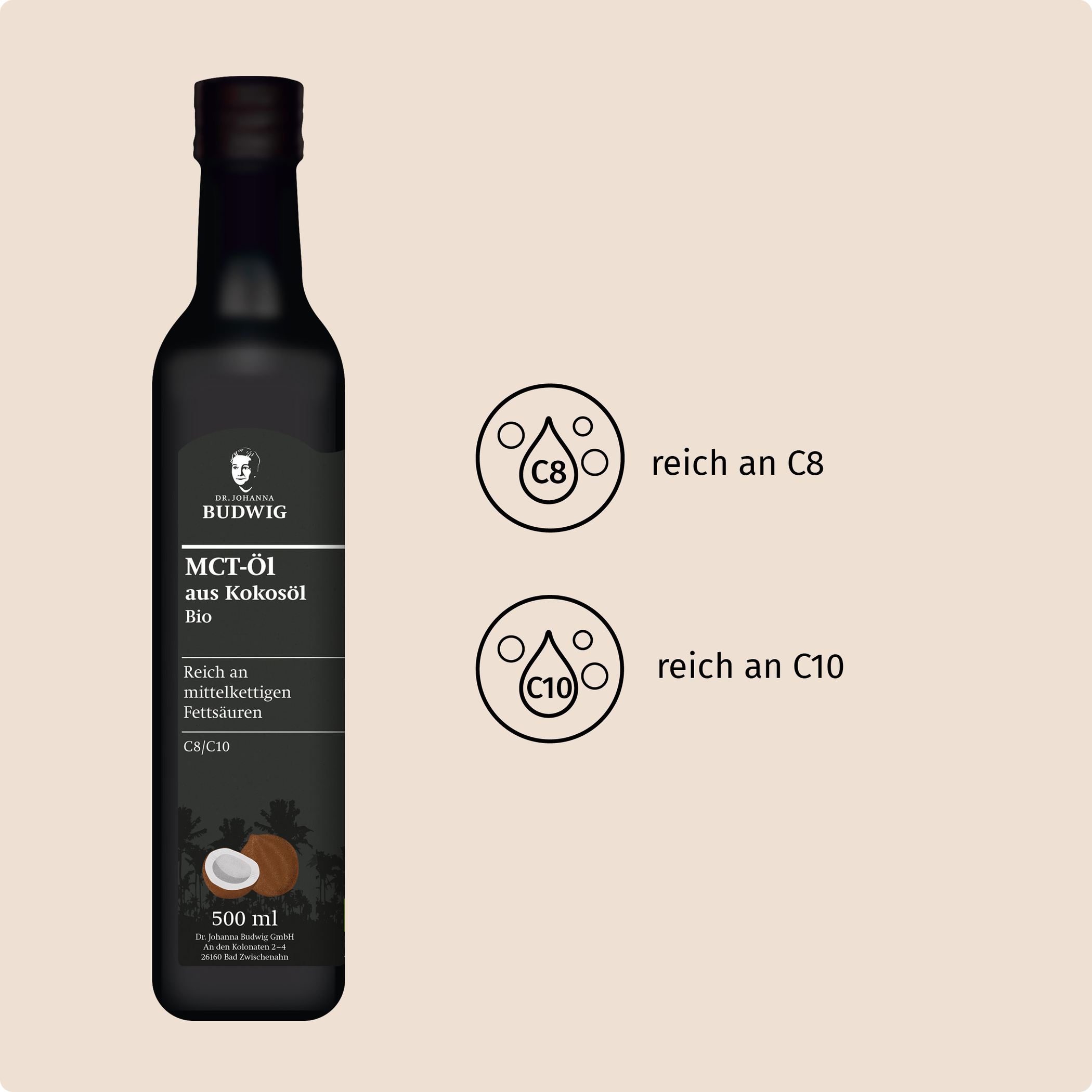 Dr. Budwig MCT-Öl ist ein wertvolles Extrakt aus kaltgepresstem Bio-Kokosöl. Mit 60 % Caprylsäure (C8) und 40 % Caprinsäure (C10) ist es reich an mittelkettigen Fettsäuren; MCT ist die Abkürzung für den entsprechenden englischen Begriff Medium Chain Triglycerides. Ein entscheidender Vorteil dieser mittelkettigen Fettsäuren ist, dass unser Körper sie im Vergleich zu langkettigen Fettsäuren besonders schnell zu spalten, zu transportieren und in Energie umzuwandeln vermag. Auch Menschen mit einem empfindlichen Darm oder einer gestörten Fettverdauung können von dem leicht verdaulichen Öl profitieren.