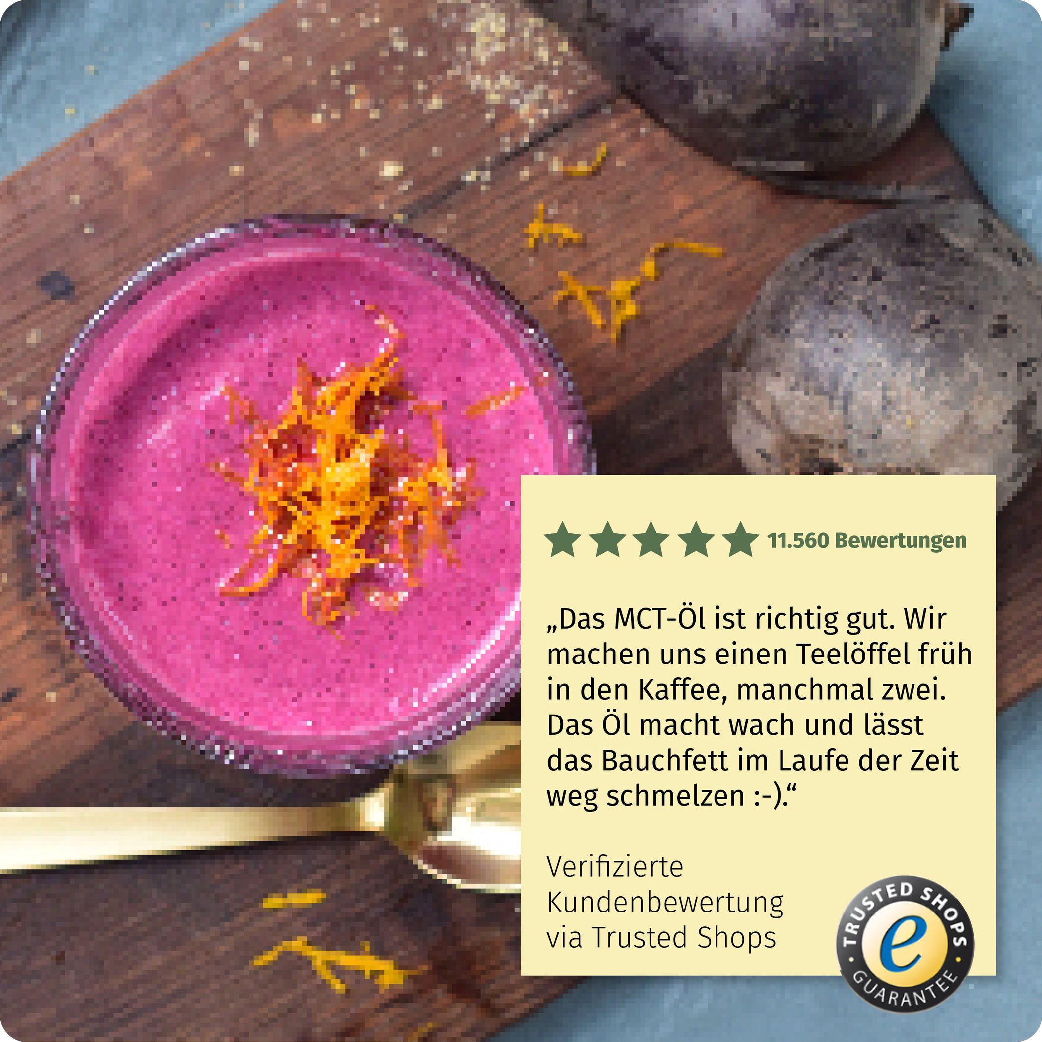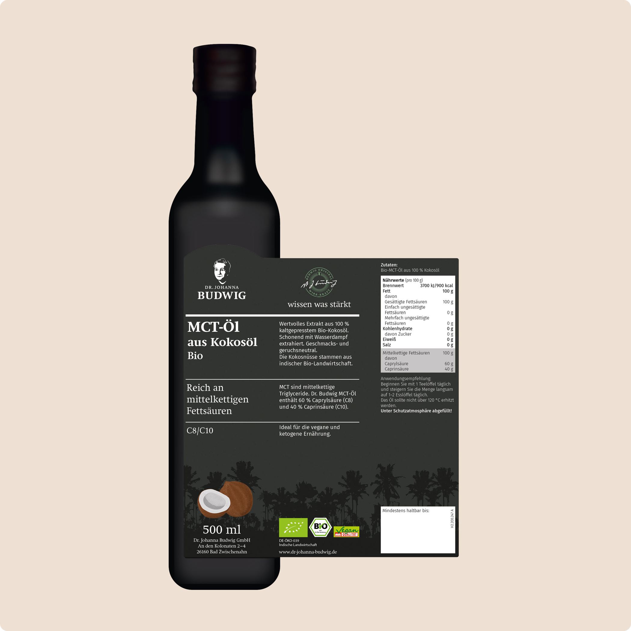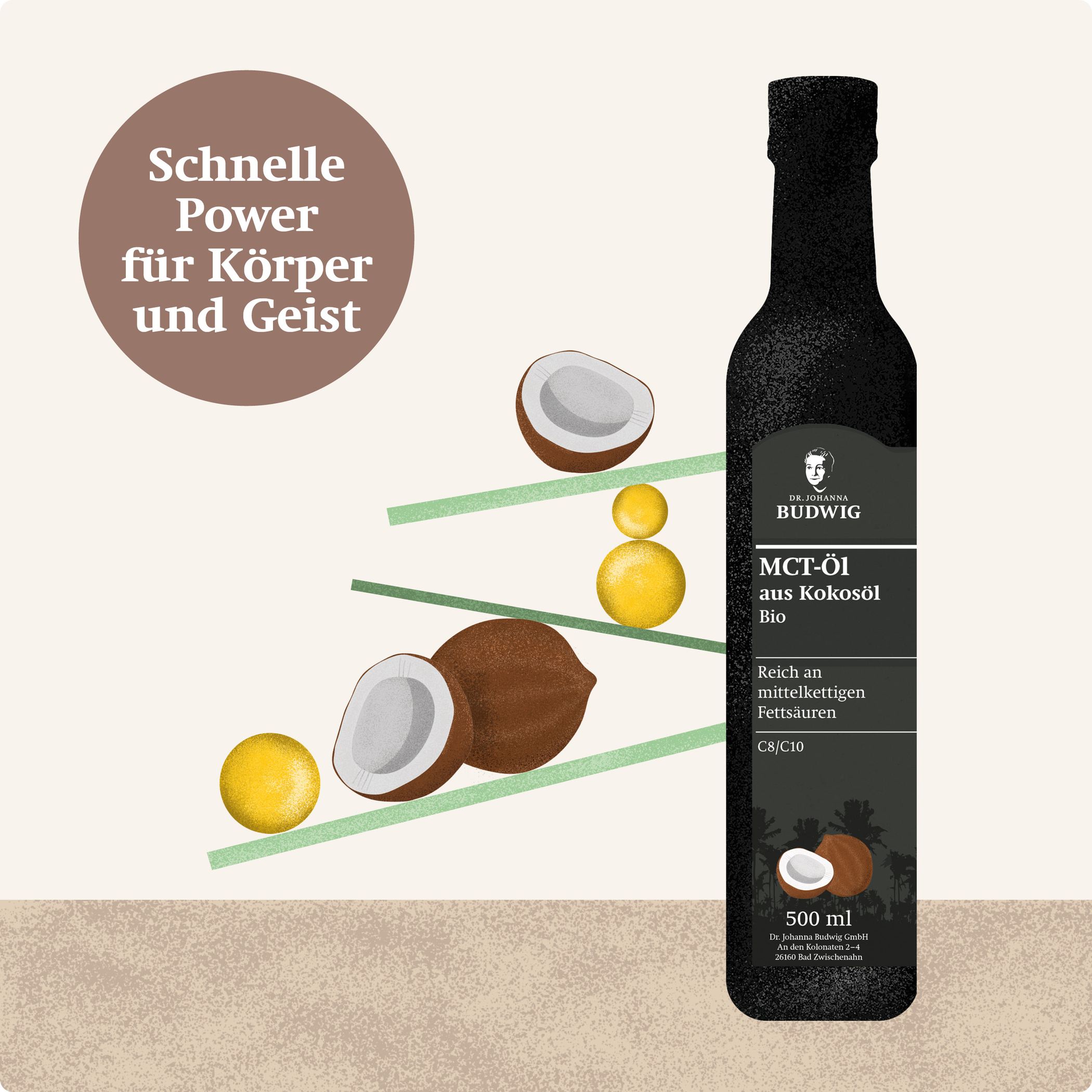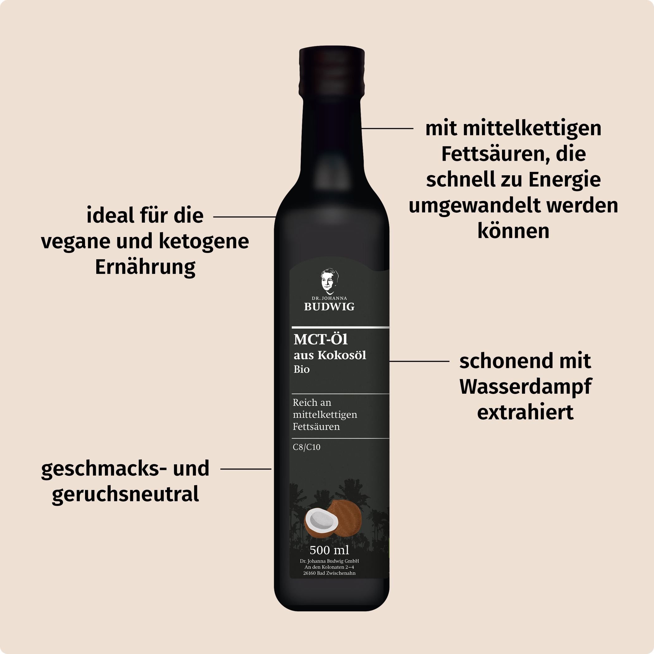 Die Kokosnüsse für das Dr. Budwig MCT-Öl stammen aus indischer Bio-Landwirtschaft. Es wird schonend mit Wasserdampf extrahiert und enthält keine Zusatz- oder Konservierungsstoffe. Das MCT-Öl ist geschmacks- und geruchsneutral und eignet sich ideal für den Verzehr am frühen Morgen: zum Beispiel im Smoothie oder als wichtigste Zutat des “Bulletproof Coffees”. Unsere Empfehlung: Beginnen Sie mit 1 Teelöffel täglich und steigern Sie die Menge langsam auf 1-2 Esslöffel täglich. Das Öl sollte nicht über 120 °C erhitzt werden