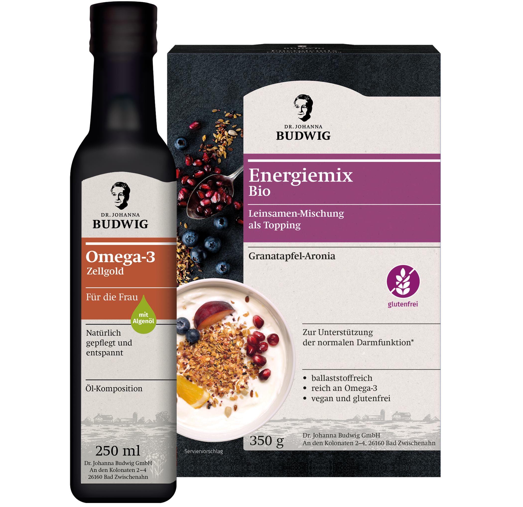 Unser Kennenlern-Paket für die Frau versorgt dich optimal mit wertvollen Omega-3-Fettsäuren, Vital- und Ballaststoffen und sorgt in Kombination mit Quark oder Porridge für einen gesunden Start in den Tag. Dr. Budwig Omega-3 Zellgold für die Frau ist eine wertvolle Komposition aus hochwertigem Lein- und Algenöl sowie weiteren wohltuenden Ölen wie Nachtkerzen- und Sanddornfruchtfleischöl. Dr. Budwig Energiemix ist eine ballaststoffreiche Kombination aus geschroteter und geschützter, gelber und brauner Leinsaat, Sonnenblumenkernen und natursüßen Erdmandeln.